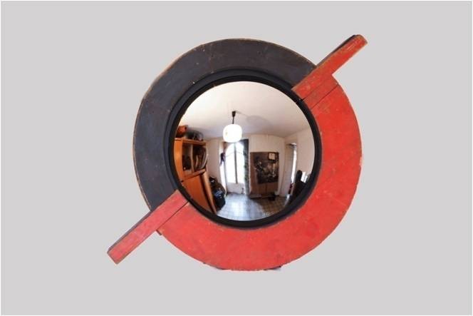 Gran espejo convexo con dos moldes de diferentes piezas de fundición, con sus colores originales. Espejo convexo 50 cm.